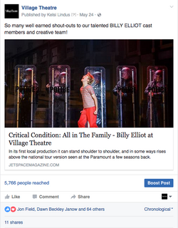 PR is an invaluable way to spread stories beyond an established audience base. From writing and distributing press releases, to maintaining relationships with a press list of nearly 400 people, to pitching stories and organizing interviews and appearances with local media, I have managed all of Village Theatre's public relations. Here are a few highlights from Billy Elliot, including an appearance at Seattle's NBC affiliated television station, KING 5.